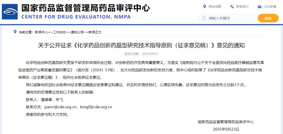 化学药品创新药晶型研究贯穿于研发和申报的全过程,对创新药的开发具有重要意义。为落实《国务院办公厅关于全面深化药品医疗器械监管改革促进医药产业高质量开展的意见》(国办发〔2024〕53号),加大对药品研发创新的支持力度,我中心组织起草了《化学药品创新药晶型研究技术指导原则(征求意见稿)》,现向社会各界征求意见。